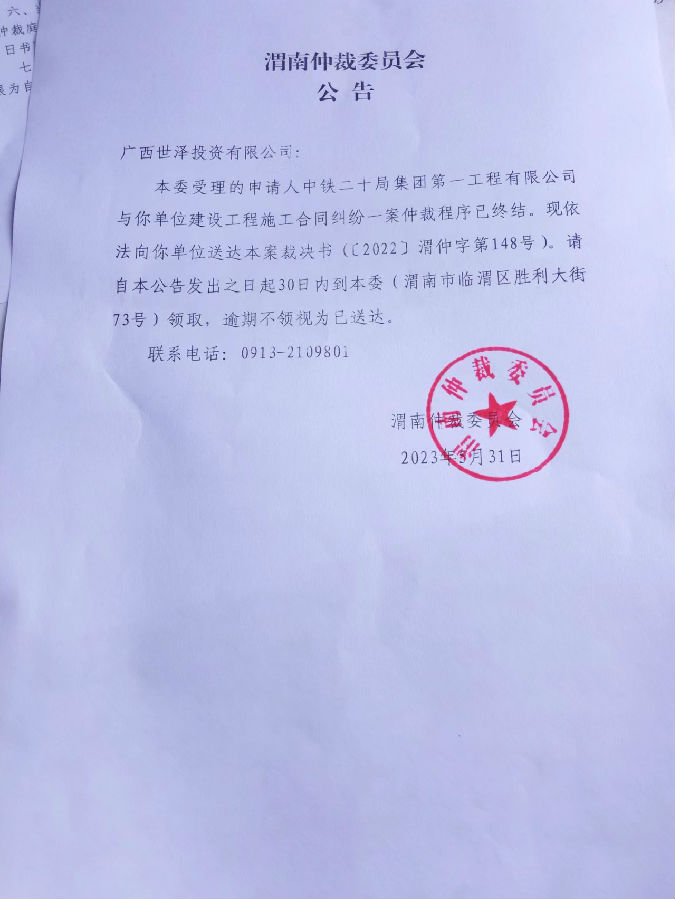 中鐵二十局集團第一工程有限公司與廣西世澤投資有限公司一案裁決書公告