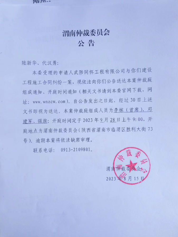 武陟同懷工程有限公司與陸新華、代漢勇一案公告